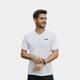 Weisses Polyester T-Shirt mit V-Ausschnitt und kurzen Ärmeln.
