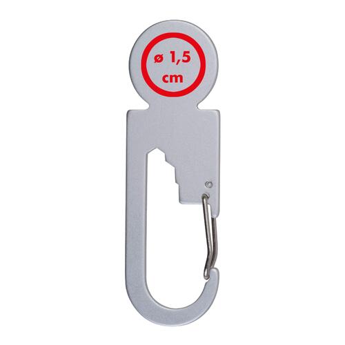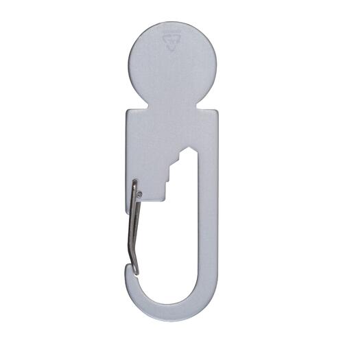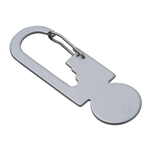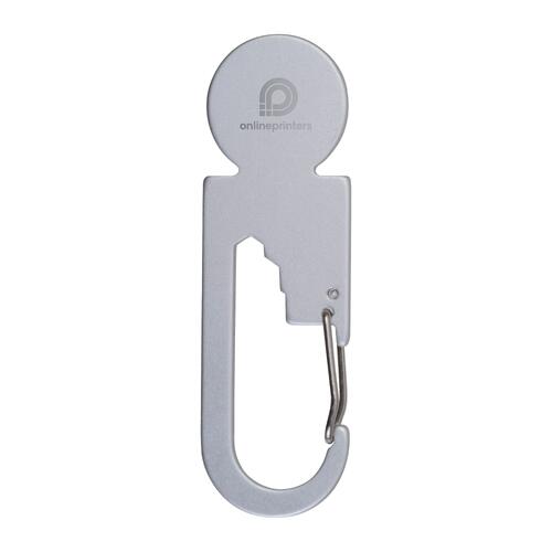 • Multitool aus recyceltem Aluminium mit Einkaufswagenchip, drei verschieden großen Sechskantschlüsseln und einem Karabiner